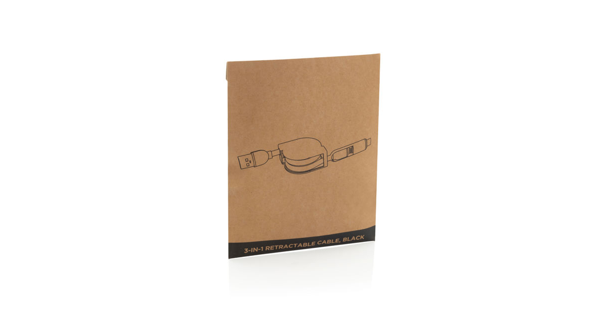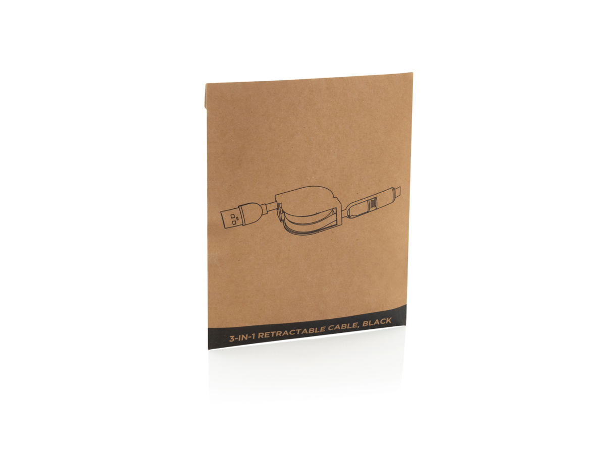 Kompakt och utdragbar 3 i 1 laddningskabel med type C och dubbelsidig kontakt för iOS och Android-enheter som kräver micro USB. Den utdragbara platta kabeln på 100cm kan lätt tas med utan att kabeln trasslar sig. Hölje i ABS, TPU-kabel. Även lämplig för synkronisering.