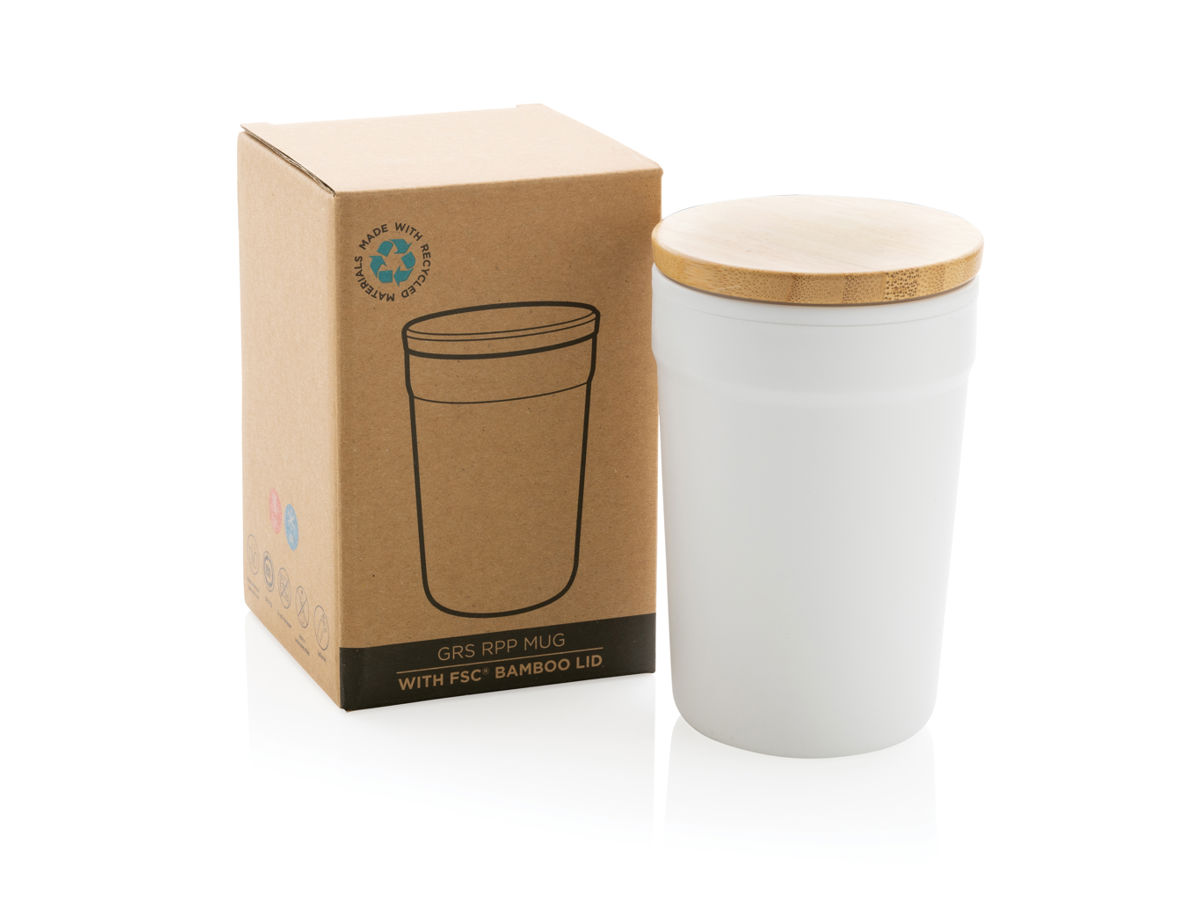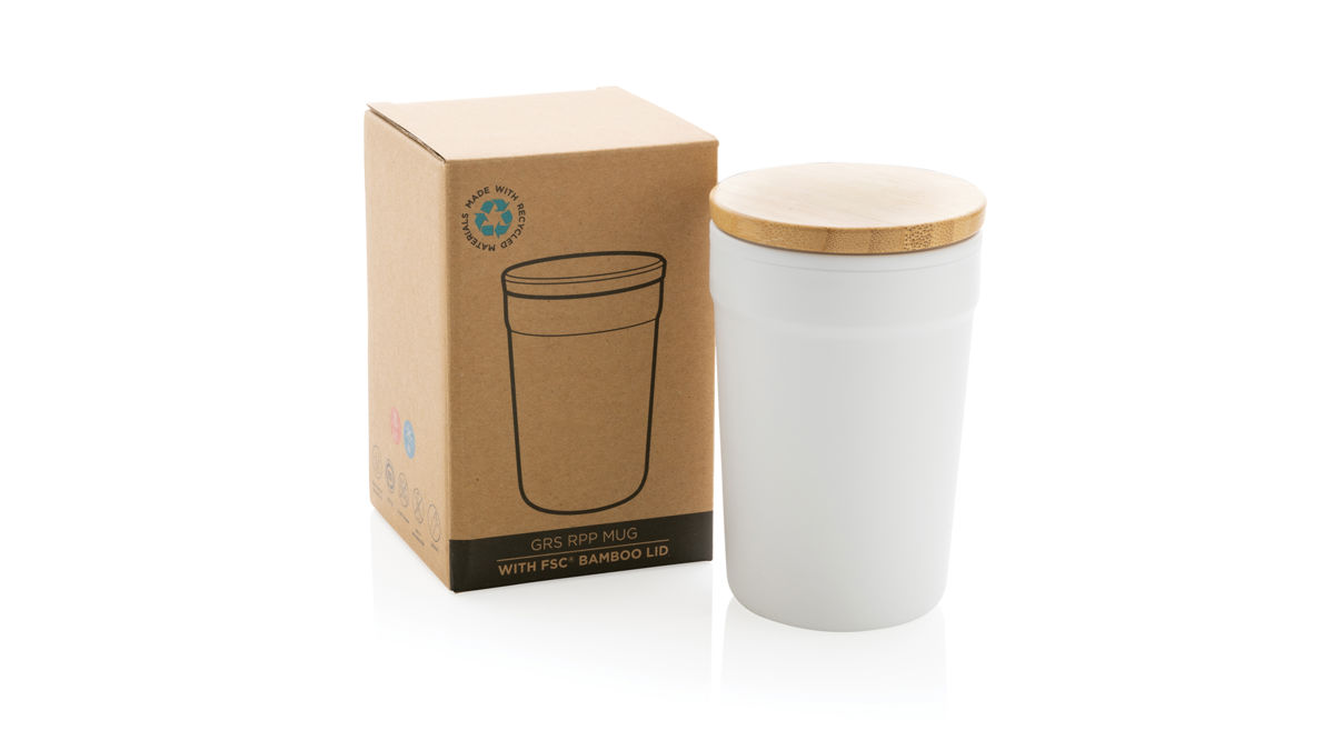 Mugg tillverkad av GRS certifierad återvunnen PP. GRS certifiering säkerställer en helt certifierad leveranskedja av de återvunna materialen. Muggen har ett lock i bambu. Totalt återvunnet innehåll: 52% baserat på total produktvikt. Själva muggen kan användas i mikro och diskas i maskin, ej locket. BPA-fri. Volym: 300ml. Levereras i FSC® certifierad kraft förpackning.