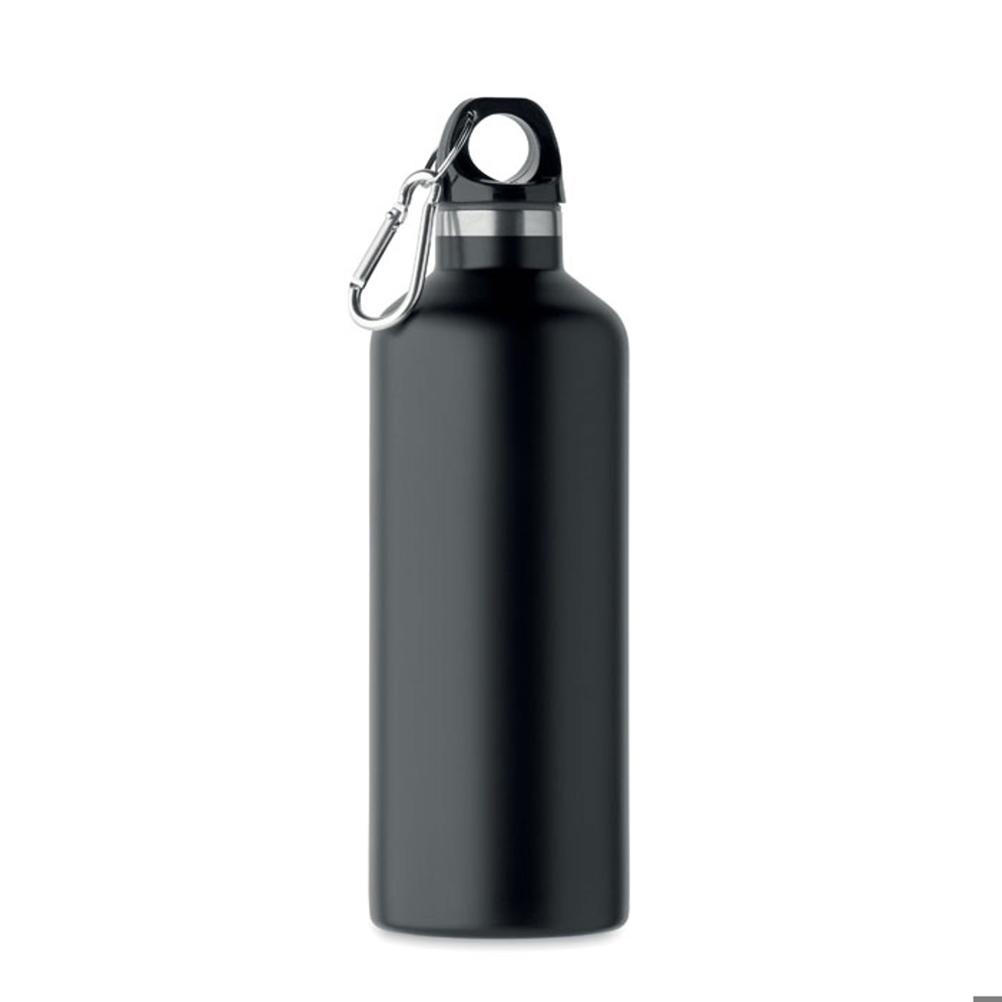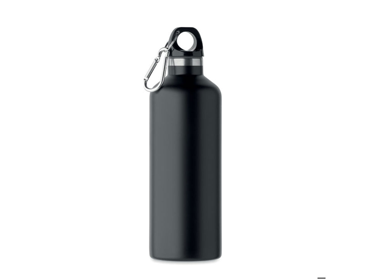Dubbelväggig vakuumisolerande flaska i återvunnet rostfritt stål (90% återvunnet rostfritt stål och 10% rostfritt stål) med lock och karbinhake. Karbinhaken är inte avsedd för klättring (ej professionellt bruk). Läckagefri. Volym: 500 ml.