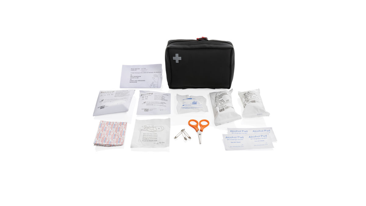 Lyxigt första hjälpen-kit i vattenavvisande nubuck-PU-material som är både snyggt och praktiskt. Materialet är lätt att rengöra och vattenavvisande, vilket gör det perfekt för användning på språng. Innehåll: 1 st PBT-bandage, 1 st PBT- och kompressbandage, 1 st triangelbandage, 1 st mun mot mun-mask, 1 par handskar, 1 st tejp, 3 st säkerhetsnålar, 1 st sax, 10 st plåster och 4 st sårservetter. Allt innehåll enligt direktiven för medicintekniska produkter: 93/42/EEG och EU (2017/745), EN ISO 13485:2016. Allt innehåll (förutom såkerhetsnålar och sax) förpackat i papperspåse märkt med alla obligatoriska märkningar som som krävs för EU-lagstiftning, till exempel Bäst före-datum, CE, LOT-nummer. Totalt återvunnet innehåll: 24% baserat på total produktvikt. RCS certifiering säkerställer en helt certifierad leveranskedja av de återvunna materialen.
