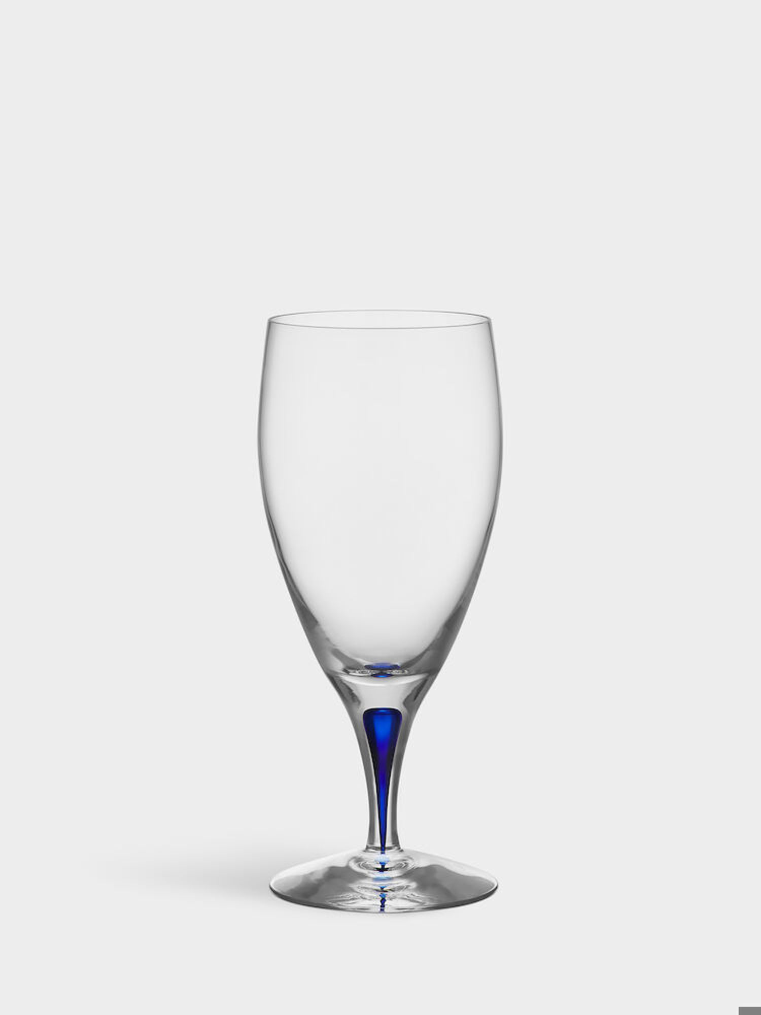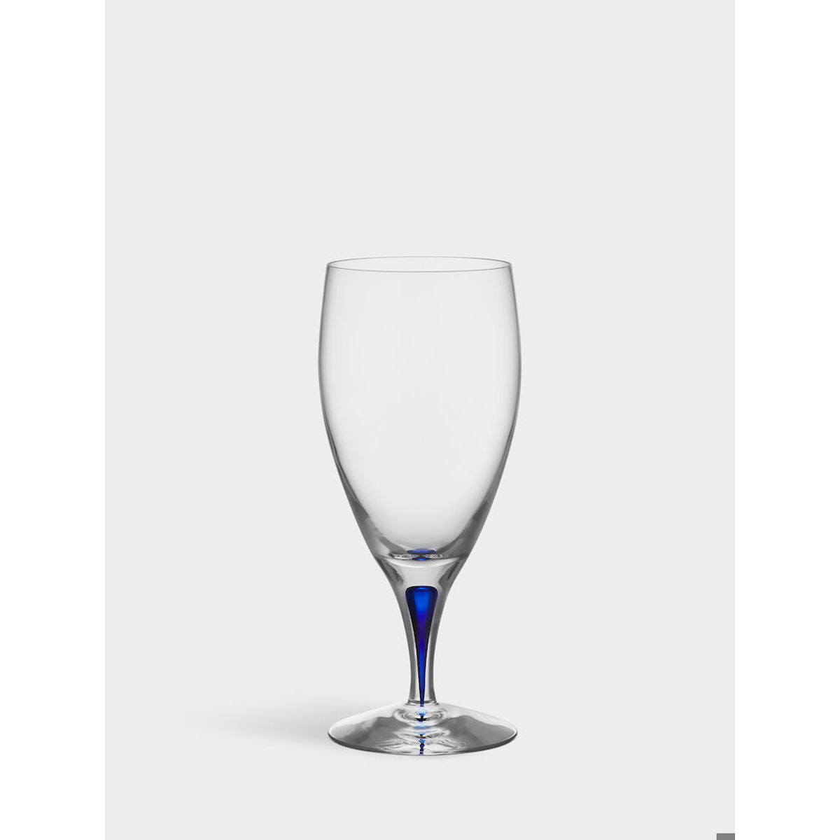 Intermezzo vattenglas från Orrefors formgavs 1984. Glaset rymmer 47 cl och är munblåst i Sverige av skickliga glasblåsare, med en blå droppe innesluten i glasets ben - en innovation som bygger på traditionellt hantverk. Formgiven av Erika Lagerbielke.