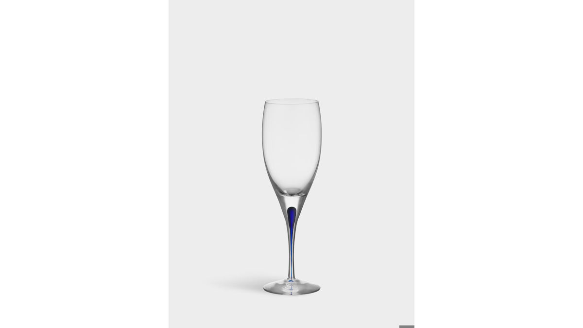 Intermezzo vin från Orrefors formgavs 1984. Glaset som rymmer 19 cl passar utmärkt till alla vita viner och den nätta storleken lämpar sig väl för viner som ska avnjutas svala. Glaset är munblåst i Sverige av skickliga glasblåsare, med en blå droppe innesluten i glasets ben - en innovation som bygger på traditionellt hantverk. Formgiven av Erika Lagerbielke.