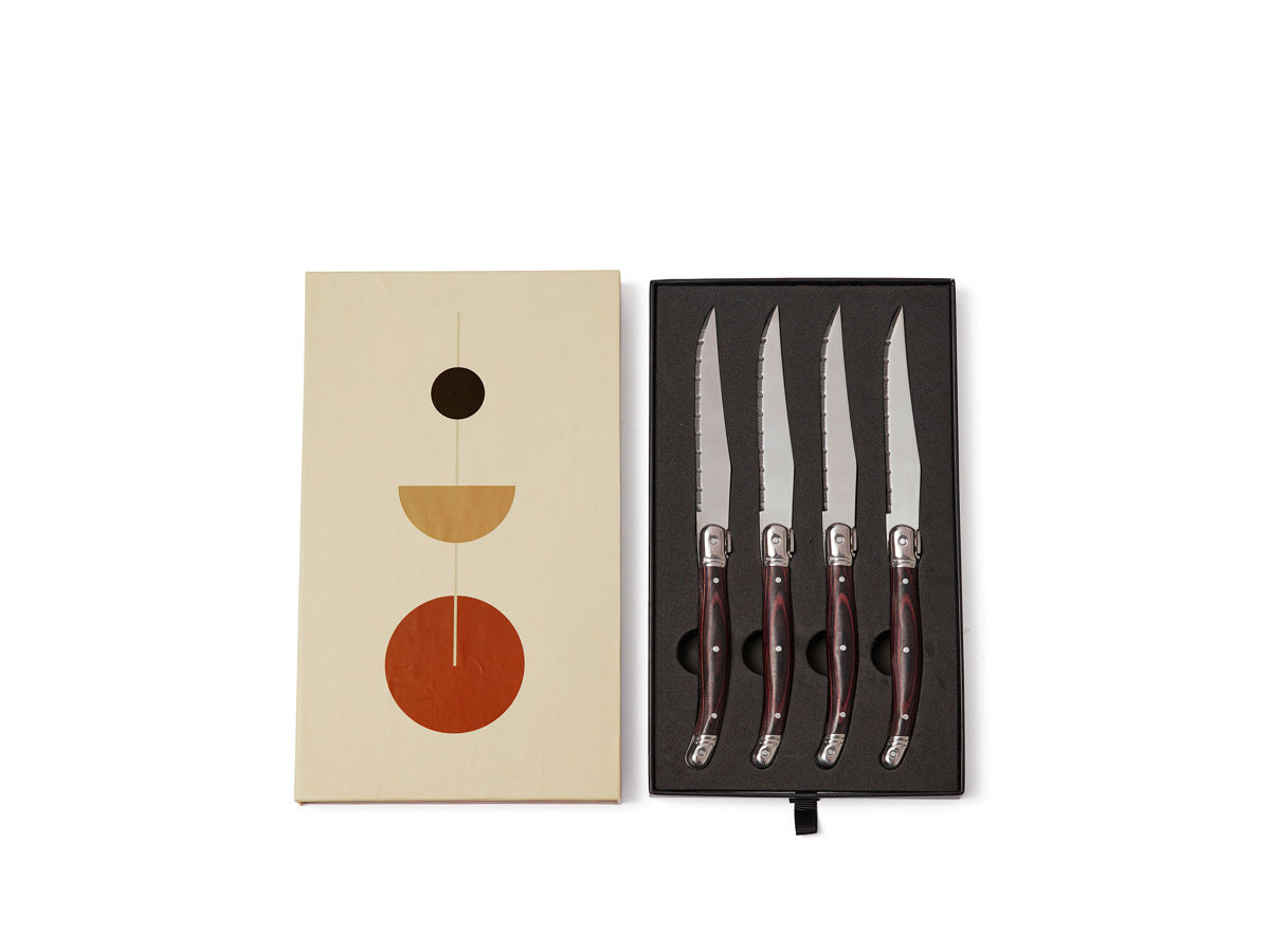 Köttknivar i typisk franskinspirerad bistrostil av hög kvalitet. Handtag av pakkaträ och blad i rostfritt högkvalitativt stål. Bladet har en fin slipning som gör att du skär igenom maten med så lite motstånd som möjligt. Ett set om fyra knivar, där du enkelt matchar med den gaffel du själv har hemma. Förpackas i en exklusiv presentkartong.