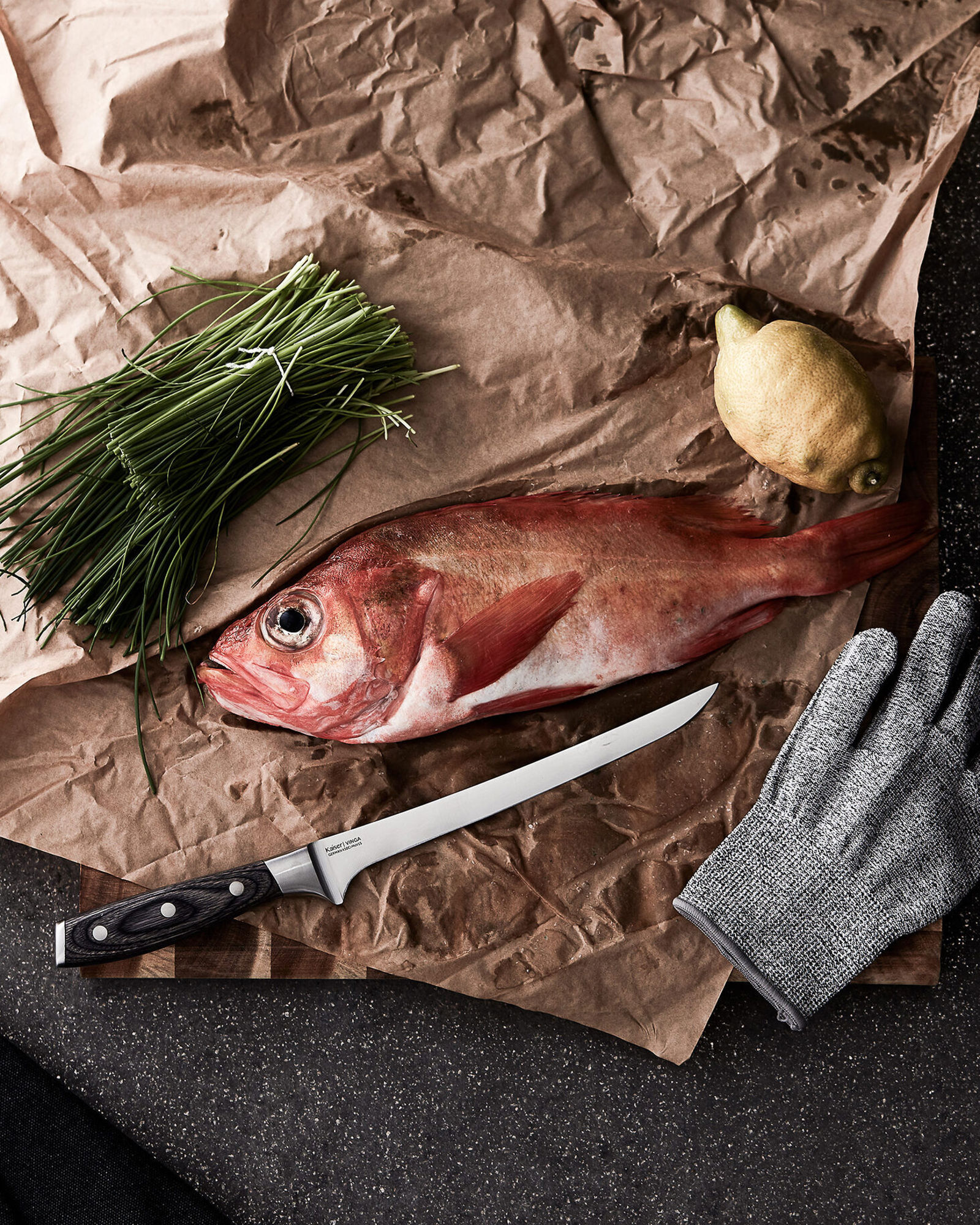 Setet består av en filékniv, stålvävd handske samt en metalltvål. Handsken förbättrar ditt grepp om den hala fisken samtidigt som den skyddar dig mot eventuella missöden. Metalltvålen tar bort de odörer från fisk och lök som vanlig tvål inte klarar av. Kniven är tillverkad av tyskt stål X50CrMoV15 och handtaget är av pakkaträ. Handtaget är greppvänligt vilket tillsammans med dess välbalanserade kropp från ände till egg gör den skönare och lättare att arbeta med. Strl: filékniv: 33 cm (bladet: 21 cm).