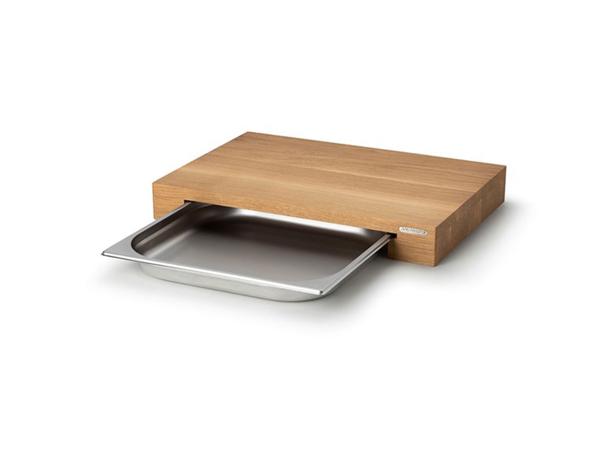 Enaftig och stabil skärbräda från Continenta med uppsamlingslåda i rostfritt stål. Då skärbrädorna är tillverkade av 100% naturligt trä (ek), är det bästa sättet att underhålla dem, genom att rengöra med fuktig trasa och olja in dem då och då med matolja (olivolja , solrosolja eller liknande). Trä reagerar på fukt och på temperaturförändringar. Båda bör undvikas samt rengöring i diskmaskin.