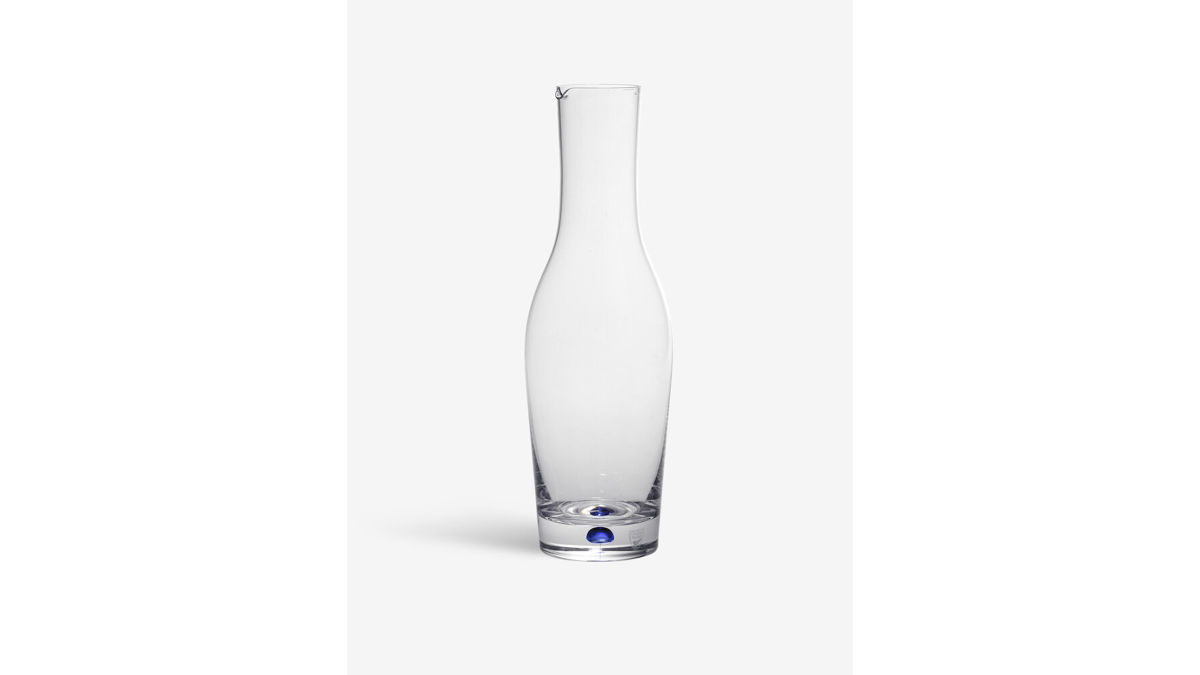 Intermezzo karaff från Orrefors formgavs 1984. Den rymmer 112 cl och är avsedd för såväl vin som vatten. Karaffen är munblåst i Sverige av skickliga glasblåsare, med en blå droppe innesluten i botten - en innovation som bygger på traditionellt glashantverk. Formgiven av Erika Lagerbielke.