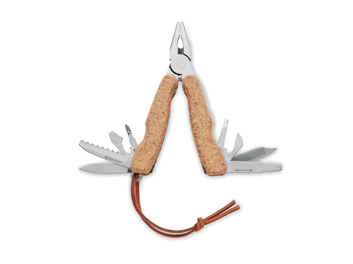 Fickkniv i rostfritt stål med flera funktioner, korkskydd och PU-handtag. 9 funktioner, innehåller: Tång, 2 öppnare, skruvmejsel med Philips-bits, sågblad, kniv, fil och skruvmejsel med platt bits.