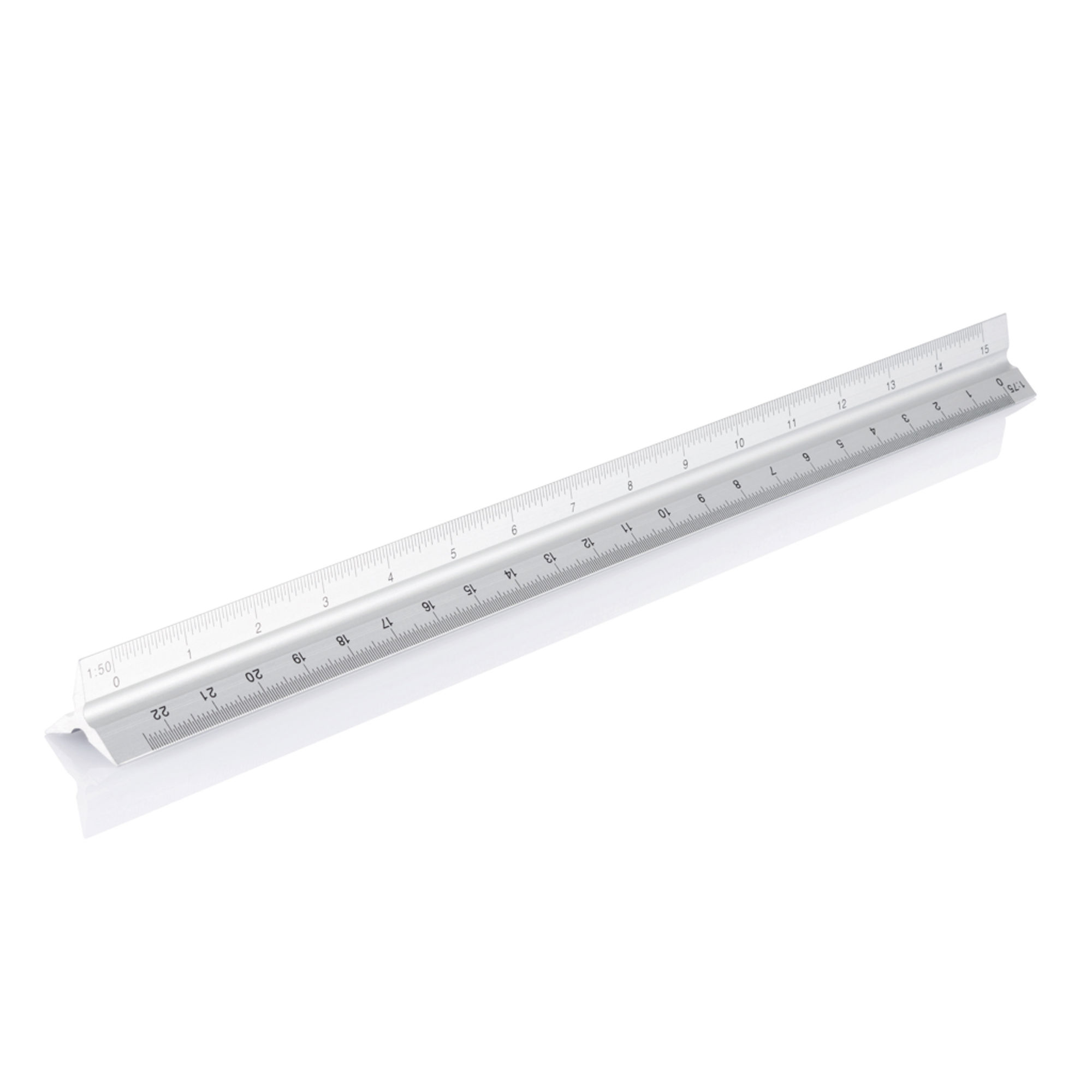 Linjal i aluminium med 5 olika skalor (1:20;1:25;1:50;1:75;1:100). En yta avsedd för tryck/gravyr.