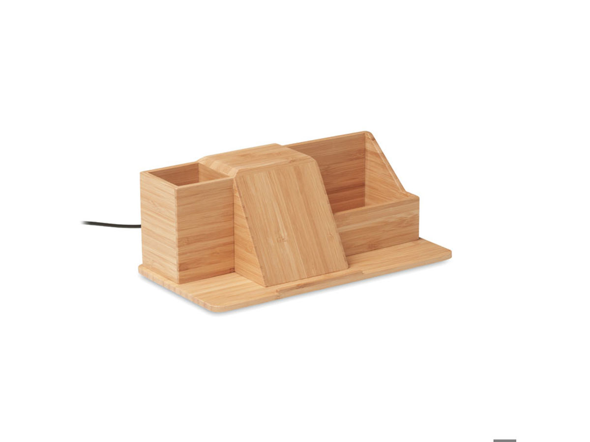 Bamboo skrivbordställ och pennhållare med 10W trådlöst laddningsstativ för telefon. Utgång: DC 9V/1.1A (15W) för snabbladdning. FSC®-certified | FSC 100 %, P5.7, FSC-C213206 FSC 100% | N5.7 | FSC-C213206