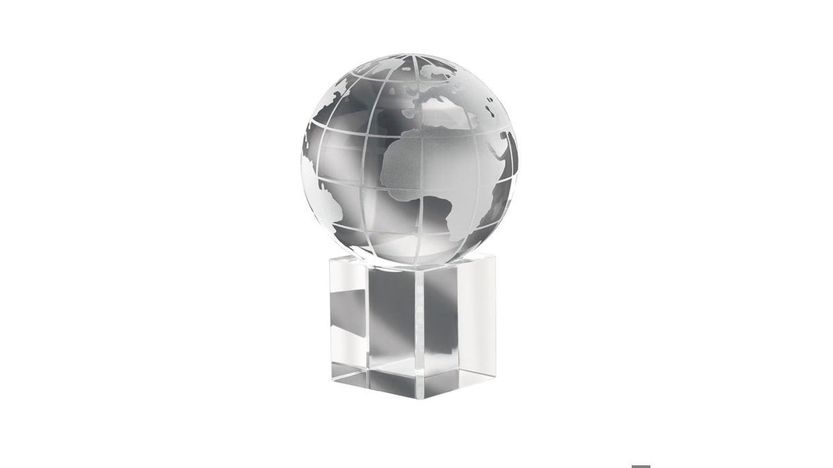 Brevpress utformad som kristallglob på fot. Förpackad i ett exklusivt presentetui.