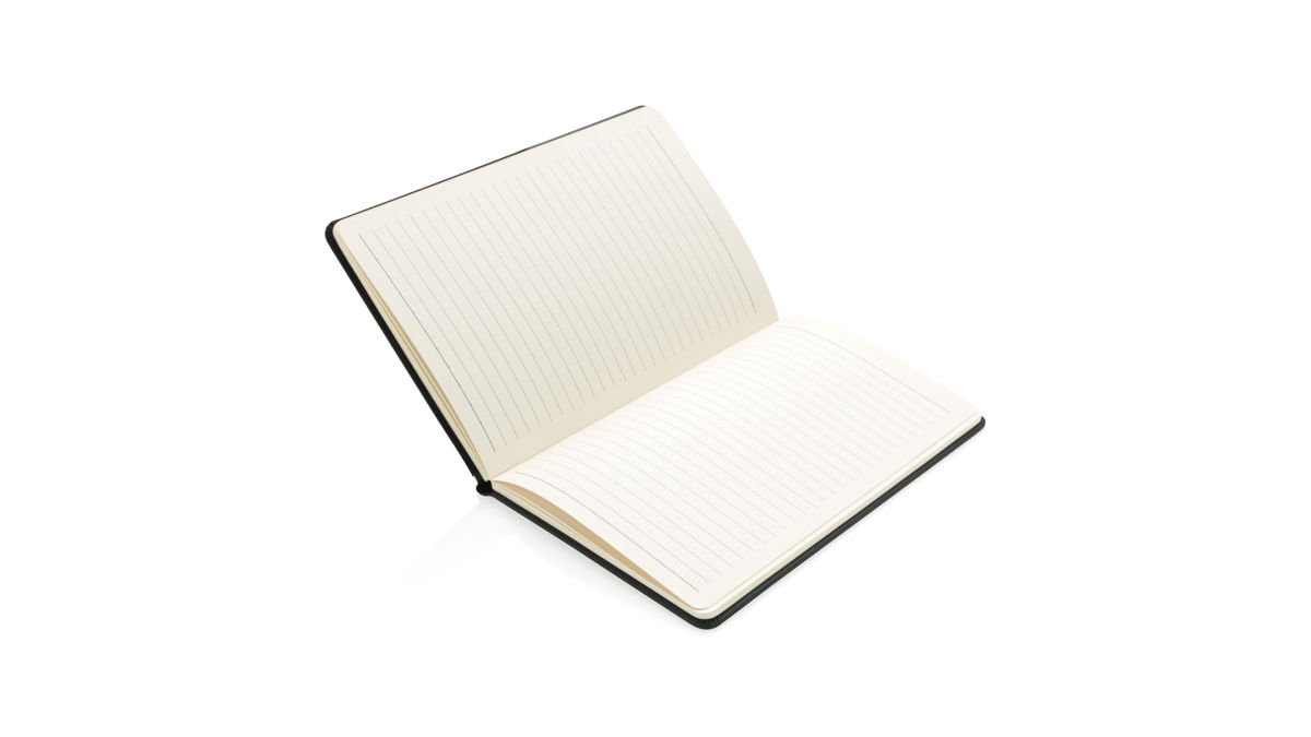 A5 anteckningsbok med 160 cremefärgade linjerade sidor. 80 g/m2. Framsidan har ett flexibelt telefonfack, pennfack samt dokumentficka. Telefonfacket är 8 cm brett, tillräckligt brett för att passa iPhone 7 plus.