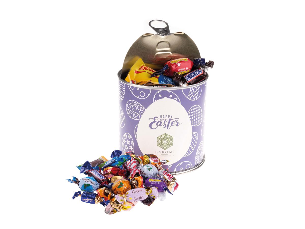 Plåtburk med konservöppning där vi digitaltrycker en banderoll efter önskemål och fäster runt burken. Fylls med 300 g inslagen choklad från välkända varumärken. På nedanstående priser tillkommer startkostnad för tryck.