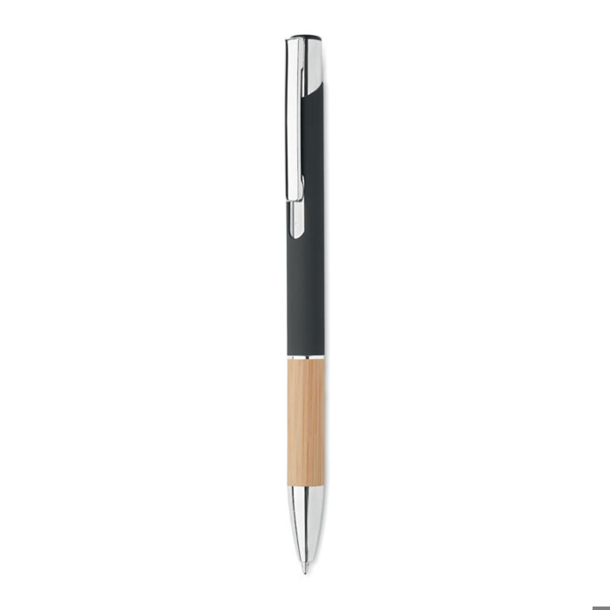 Tryckknappspenna i aluminium med bambugrepp. Blått bläck.