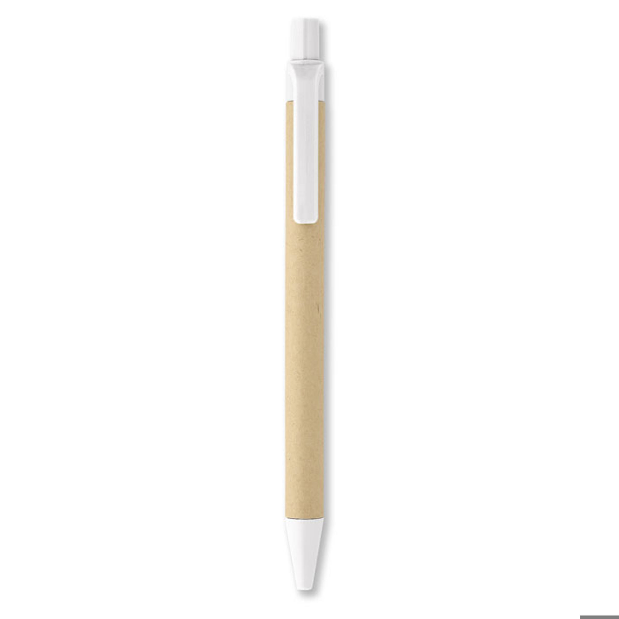 Kulspetspenna med tryckmekanism. Tillverkad i biologiskt nedbrytbart plast (53%) och återvunnen papp. Blått bläck.