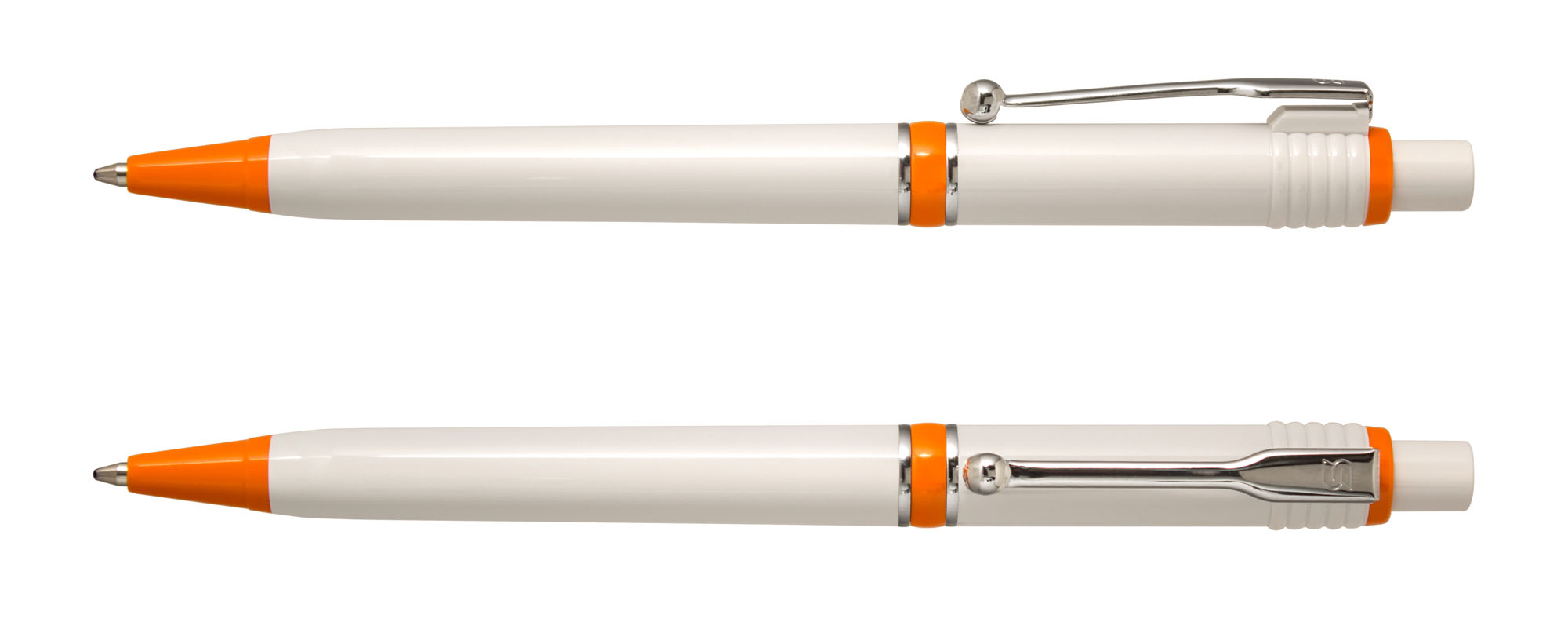 Italiensk kvalitetspenna med tidlös och elegant retrodesign. Finns i flera utföranden och färgkombinationer. Här med vita högblanka pennkroppar och färgade plastspetsar.
