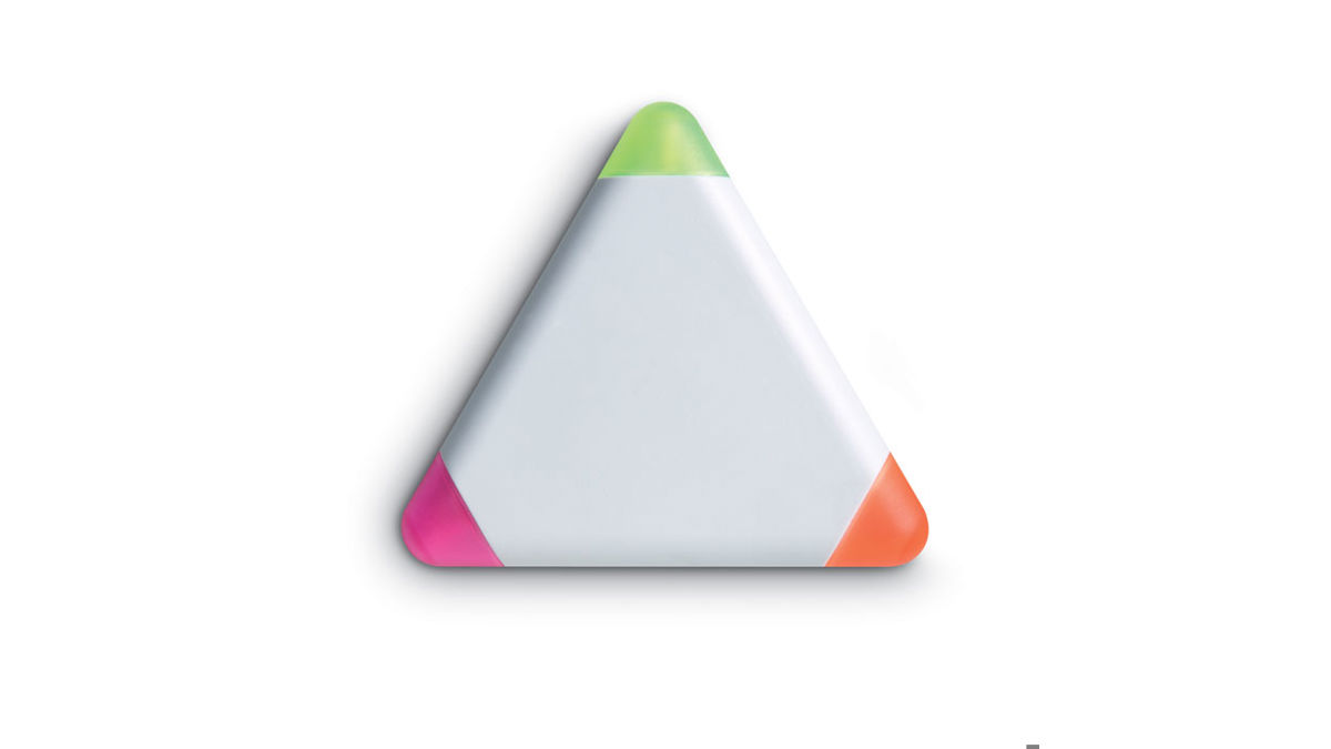 Trekantig överstrykningspenna i ABS med 3 olika färger: gul, fuchsia och orange. Stor tryckyta.