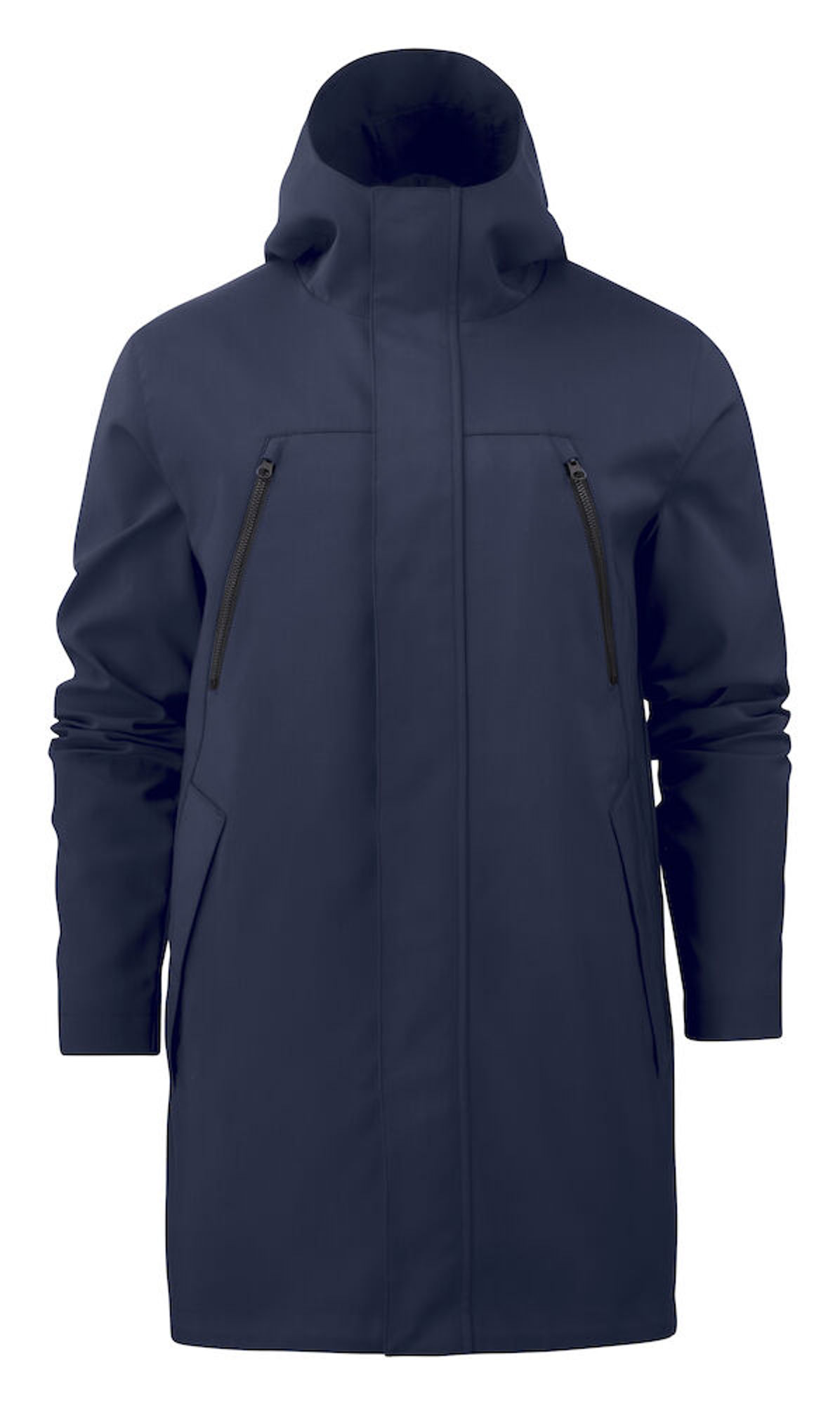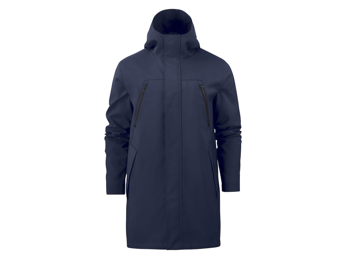Cityparkas med huva. Att bära tex över en kostym. Reglerbar i midjan (på insidan) och längst ned. Mattsvarta metal stoppers på insida/ fåll.