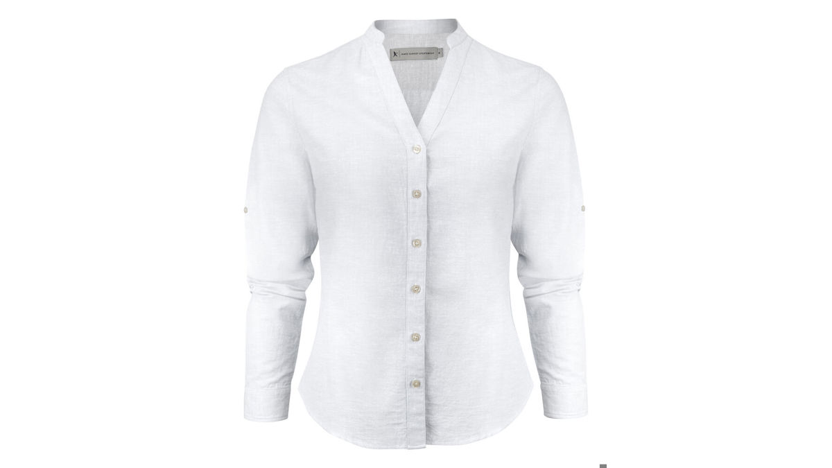 V-ringad kraglös skjorta i linne-blandning med justerbara ärmslut. Pärlemorliknande knappar. Kontrasttyg på insidan av ok och ärmslut. Garnfärgad.