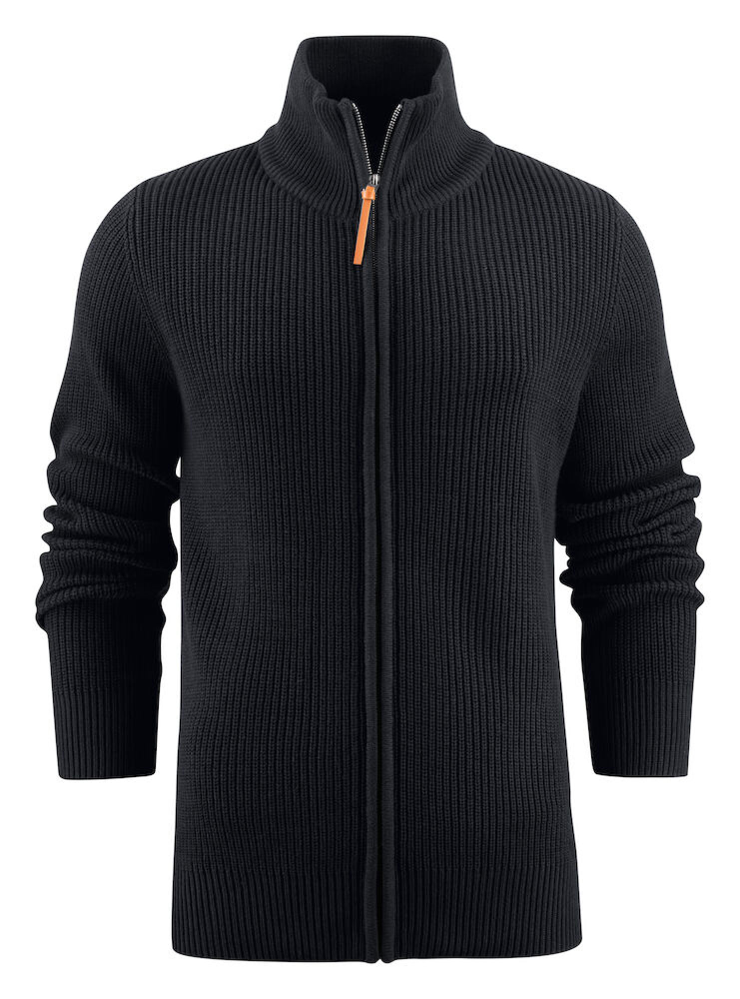 Grovstickad cardigan. Metallblixtlås med läder-lik zip-puller. Armbåges ”patches” (slätstickade i samma garn). Ribbstickat avslut på kropp, ärm och krage (dubbel).